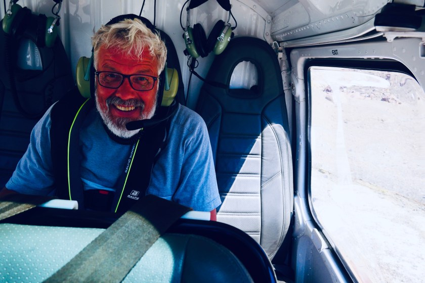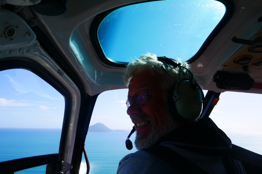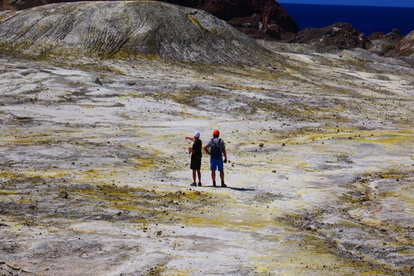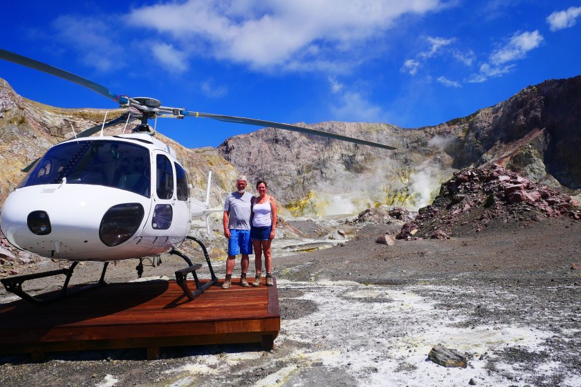 9:30 Sicherheitseinweisung, sowohl, was das Thema „Fliegen“, als auch was das Thema „Herumspazieren auf dem Vulkan“ angeht, dann noch kurz unterschreiben, dass man für alles was passiert, natürlich niemanden in Haftung nehmen kann und wer im Notfall angerufen werden soll. Da steigt die Laune ja gleich ins Unermessliche. Aber wir sind so gespannt auf diesen Ausflug, dass uns auch all das nicht von unserem Vorhaben abbringen kann.Unser Pilot und Guide heisst Peter, er stammt aus Schottland, ist aber bereits seit seiner Kindheit in Neuseeland. Den britischen Pass hat er noch, ob er ihn nach dem Brexit auch behält, weiss er noch nicht. Jedenfalls fühlt er sich durch uns daran erinnert, dass er ihn vielleicht mal wieder verlängern lassen muss.White Island liegt etwa 50 Kilometer vor der Ostküste in der Bay of Plenty. Ist der einzige aktive Vulkan Neuseelands und der am besten erreichbare der Welt. Mit dem Hubschrauber der Marke „Airbus“ (Seit wann baut Airbus Hubschrauber??? peinlich, dass ich das als Hamburgerin nicht weiss!) sind wir nur knapp 30 Minuten unterwegs. Wir umfliegen die Insel und den Krater, dann fliegt Peter in den Krater, wo mehrere kleine Holzpodeste stehen. Eines davon nutzt er als Landeplatz . Außer uns Dreien ist im Moment niemand auf der Insel. Wir setzen unsere Bauhelme auf und bekommen eine Gasmaske umgehängt „nur für den Fall, dass die Schwefelkonzentration zu stark werden sollte“. Schluck, aber noch ist die Faszination größer als das Unbehagen. Außerdem verrät Peter uns, wo es einen Schutzraum gibt, falls etwas passieren sollte: In Küstennähe steht ein Container. Sollten wir uns im Bedrohungsfall verlieren, sei das der Anlaufpunkt. Peters Scherz, dass dort dann auch eine Hostess mit kalten Getränken und Schnittchen warten würde, wirkt befreiend. Wir lachen gemeinsam und der kurze Moment Angst ist vergessen.