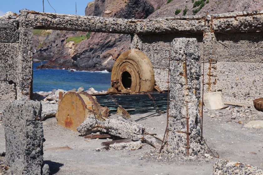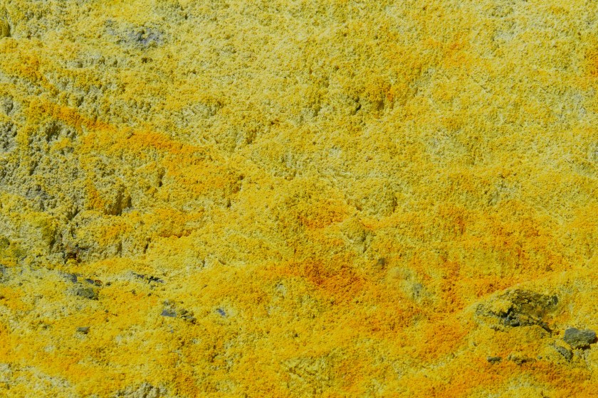 Mitten in der Caldera steht die Ruine einer Fabrik. Noch bis Anfang des letzten Jahrhunderts wurde hier in einer Mine Schwefel abgebaut. Damals lebten die Minenarbeiter sogar auf der Insel. Bei einem Einsturz einer Kraterwand wurden alle Beschäftigen verschüttet und getötet, lediglich ein gelber Kater, so heisst es, habe damals das Unglück überlebt. Danach wurde die Fabrik nach einigen Jahren noch einmal aufgebaut, aber nicht mehr genutzt, da Schwefel viel billiger als Nebenprodukt der Raffinierung von Öl zu haben war.Dass die Fabrik heute dort als Ruine steht ist nicht dem Vulkan anzulasten. Ein Zyklon, der dort vor vielen Jahren über die Insel fegte, zerlegte das Gebäude und verschüttete das gesamte Erdgeschoss. Heute leben auf der Insel nur noch Tölpel. Diese großen Vögel haben hier eine ihre drei Brutkolonien in Neuseeland. Das Pulverfass auf dem sie sitzen, scheint sie nicht zu störenPeter führt uns über die Insel. Er zeigt uns die Fumerolen, aus denen das Gas und reichlich heißer stinkender Dampf entweicht. An einer Stelle macht er einen 10 Zentimeter tiefen Schlitz in den Boden und läßt uns die Hand hineinhalten. Es ist richtig heiß!! Immer wieder gibt er klare Anweisungen bei ihm zu bleiben und zu schauen, wo er hintritt. Rr kennt die Insel und weiss sehr genau, wo es gefährlich werden könnte. Nicht überall kann man gefahrlos langgehen, der Untergrund ist in manchen Bereichen instabil und unter der Oberfläche brodelt es mit Temperaturen von 600 – 800 Grad!Der Schwefel färbt nicht nur Wände und Gesteinsbrocken ein, es bildet auch Kristalle auf dem Stein, die trotz des giftig wirkenden Gelbs wirklich schön anzusehen sind. Nur einmal halten wir die Gasmaske kurz bereit, als sich der Wind dreht und die Dämpfe kräftig in unsere Richtung ziehen.Inzwischen sind zwei weitere Hubschrauber gelandet. Die beiden Grüppchern gehen aber gegen den Uhrzeigersinn durch den Krater, sodass wir uns nur einmal begegnen. Da sie direkt aus Rotorua kommen, haben sie einen längeren Anflug und halten sich deshalb auch kürzer auf der Insel auf. Glück für uns ;:-)!