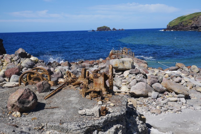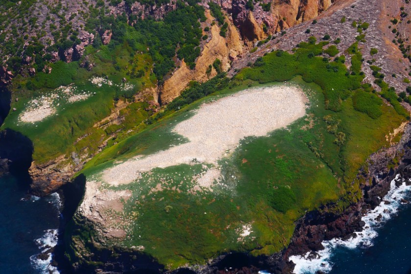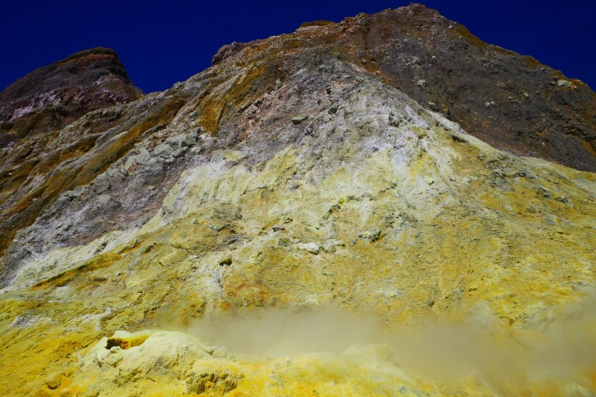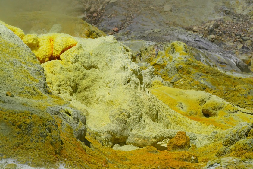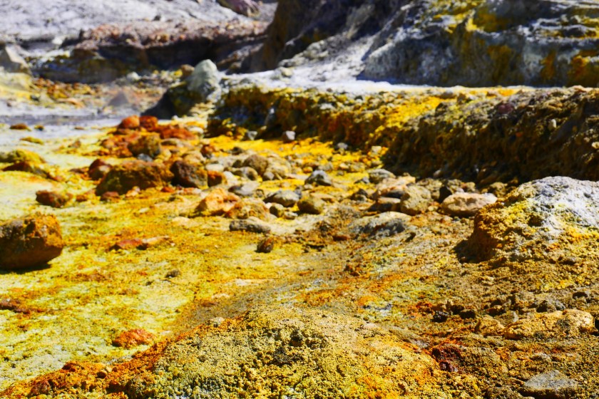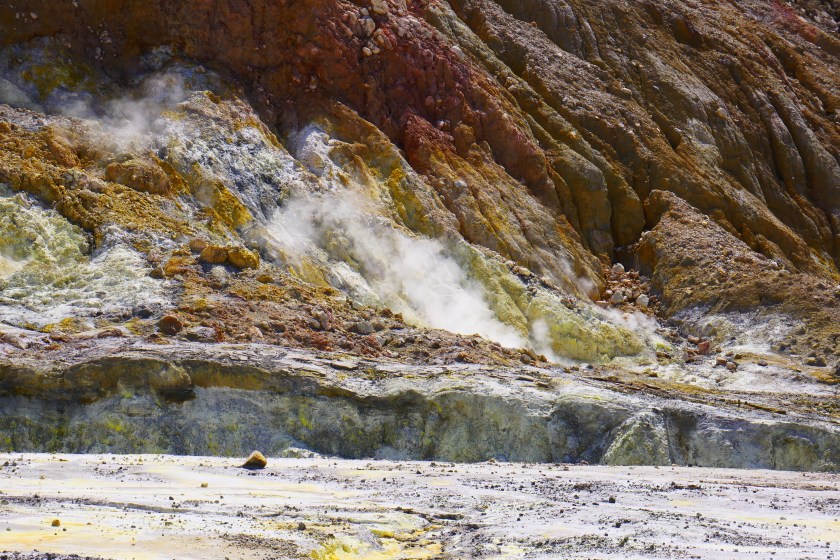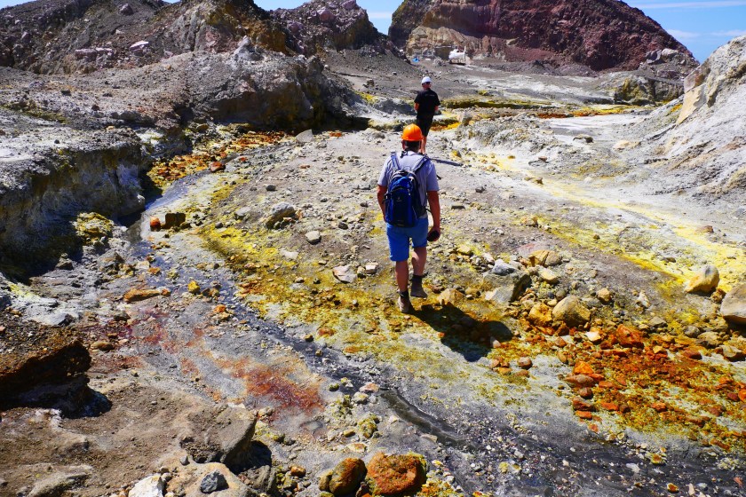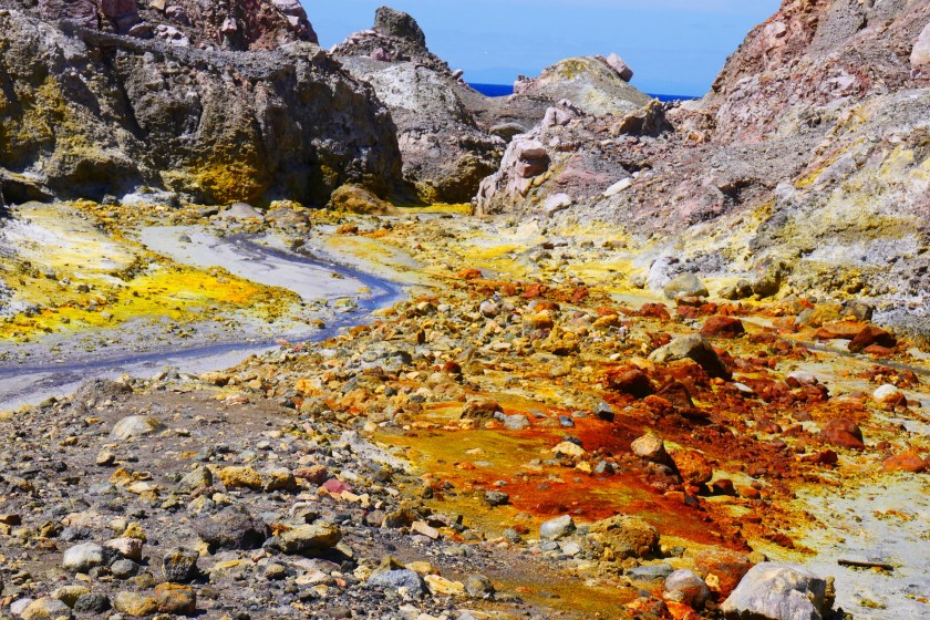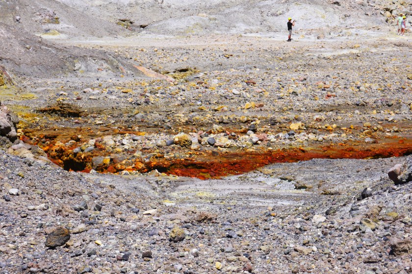 Doch es kommt kein Monster, stattdessen setzen wir unseren Rundgang fort.Peter zeigt uns breite Spalten, die sich durch den Grund ziehen….… und einen kochend heißen kleinen Bach. Hier mischt sich das Gelb des Schwefels mit einem – im wahrsten Sinne des Wortes – rostigen Rot. Dieses Wechselspiel der Farben läßt das Bedrohliche völlig in den Hintergrund treten. es sieht einfach nur unglaublich schön aus, was die Natur hierher gezaubert hat.Vollgestopft mit einmaligen Eindrücken verlassen wir die Insel.Und so schön dieser Ausflug auch war: Die Tölpel kann ich nicht verstehen. Ausgerechnet auf Neuseelands einziger aktiver Vulkaninsel zu brüten, käme mir nicht in den Sinn, aber vielleicht haben die Vögel so weniger Arbeit, die Wärme fürs Brüten liefert vielleicht ja der Vulkan? 🙂