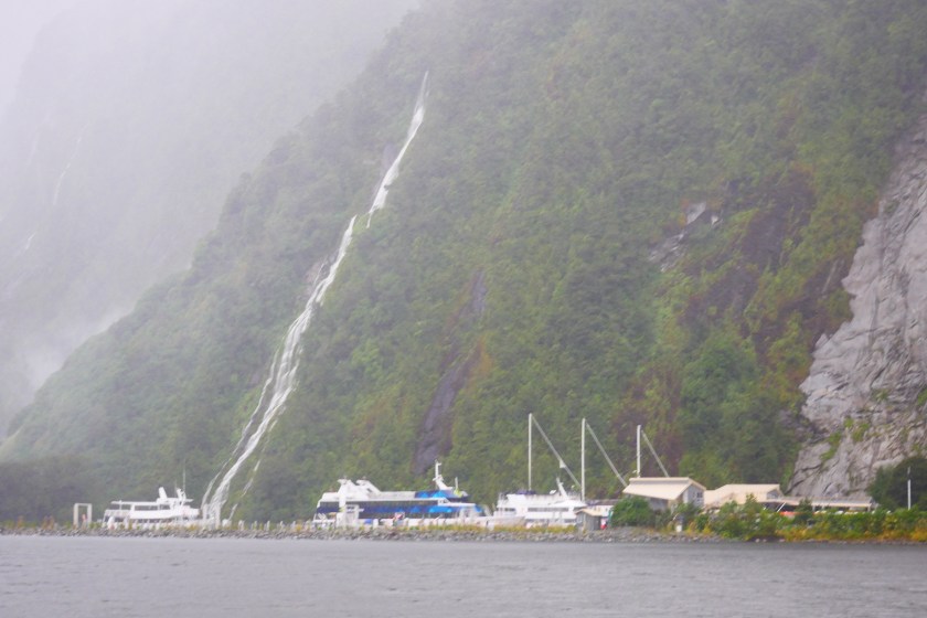 Die enge Schlucht, durch die die Milford Road führt, ist gesäumt von sensationellen Wasserfällen, auf den Bergen sieht man – wenn der Nebel es zulässt – Schneefelder und immer wieder Gletscher, links und rechts der Straße begegnen einem entweder steile Felswände, in den breiteren Talabschnitten fast gelbe, steppenähnliche Weideflächen oder aber undurchdringlicher sattgrüner Regenwald.