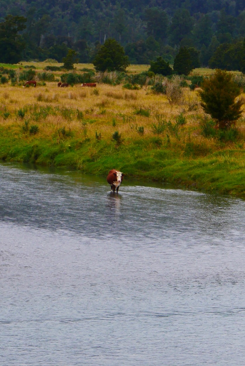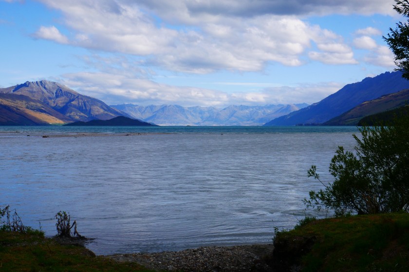 Unser Platz liegt direkt am Wasser, aus unserem Wohnmobilbett schauen wir fast bis Queenstown. Direkt nebenan fliessen die Flüsse in den hier noch flachen See, die Strömung ist stark, es rauscht kräftig. Also wieder kein idealer Angelplatz für Christoph. Trotzdem macht er sich in Roberts Begleitung auf den Weg, um vielleicht doch ein Stelle zu finden, wo er die Angel ins Meer halten kann.