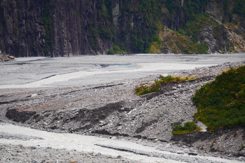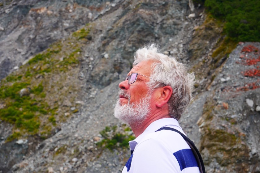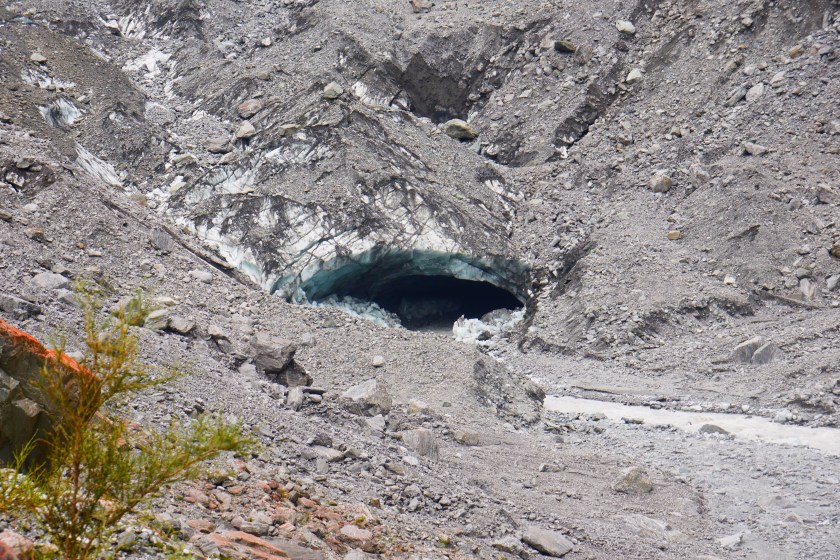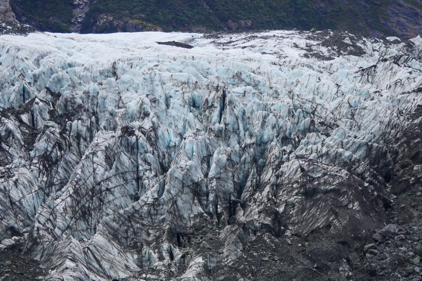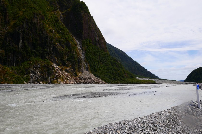 Am Fox Glacier machen wir Zwischenstation und entschliessen uns zu einer kleiner Wanderung, die uns in etwa einer Stunde deutlich dichter an die Gletscherzunge bringen soll. Schon von unten sehen wir Teile des Gletschers, der, nachdem wir ja bereits eine Weile am sonnigen Strand entlang gefahren sind, fast surreal wirkt: Strand und Gletscher, das geht für so einen Durchschnittseuropäer wie mich noch immer nicht zusammen.