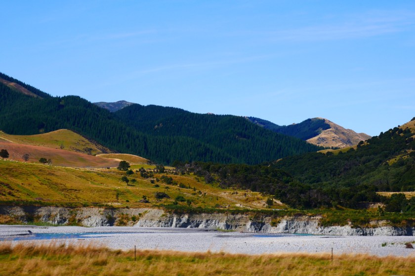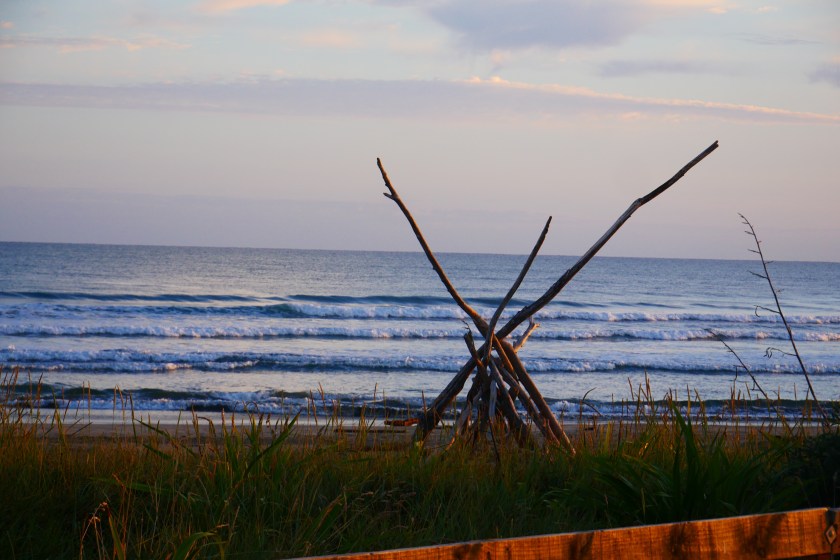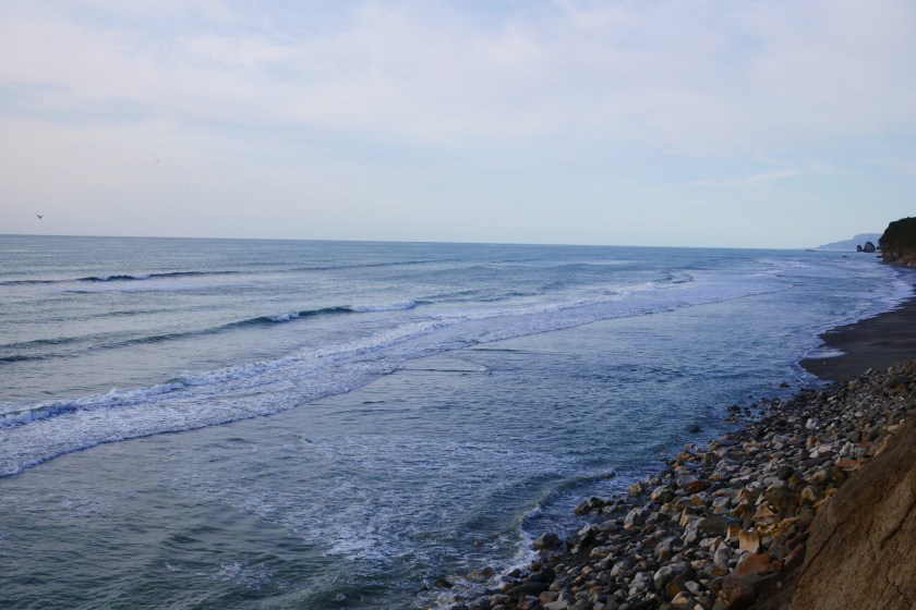 Bis zur Küste fahren wir nur eine gute halbe Stunde, und schon wieder tauchen wir ein in eine völlig andere Welt. Neuseeland zeigt uns das nächste seiner vielen Gesichter. Es ist warm und sonnig, vor uns liegt ein breiter Strand, teils mit Sand, teils mit Kies und wieder diesen altbekannten runden flachen Steinen.