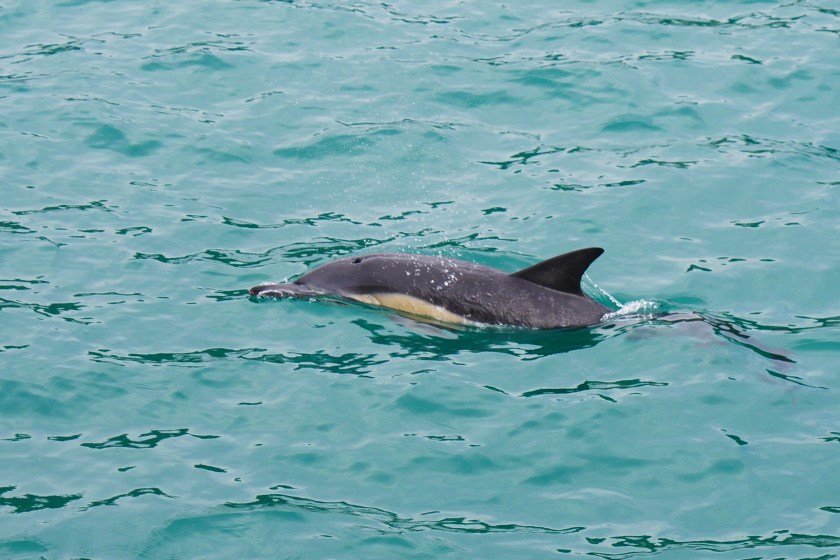 Nach etwa zwei Stunden auf dem Wasser geht es zurück in Richtung Hafen. Auf dem Weg machen wir noch Station bei einer großen Gruppe von Schwarzdelphinen. Sie toben um unser Boot herum und haben sichtlich Spaß dabei. In einiger Entfernung vollführen sie wahre Kunststücke, schlagen Saltos in der Luft, drehen Schrauben und vollführen waghalsige Sprünge.