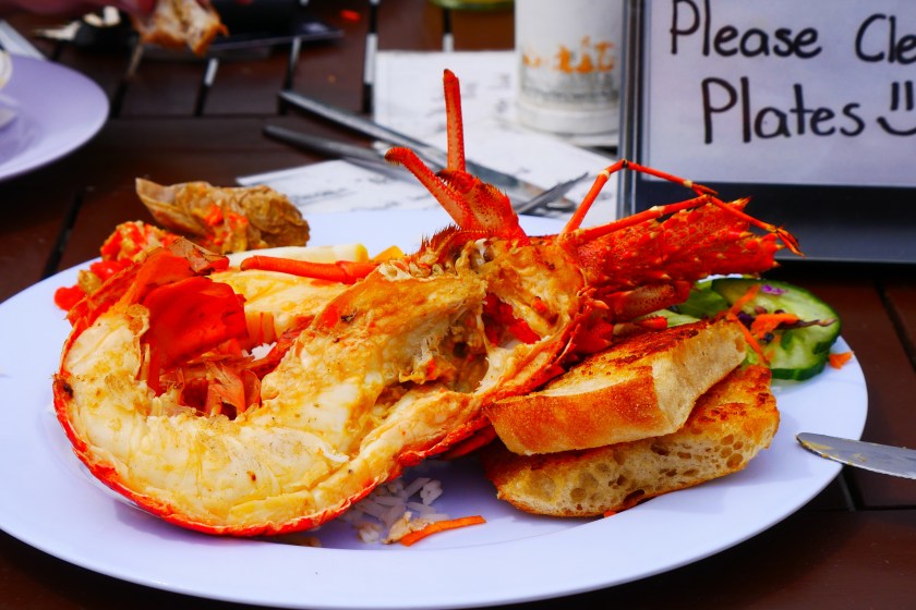 An der Strasse auf die Peninsula steht eine kleine Bude zwischen Strand und Strasse. Dort gibt es, frisch vom Grill, mehrere Fischarten und vor allem Hummer, oder, wie die Neuseeländer sagen, „Crayfish“, den man sich selbst aus einer Kühlbox auswählt und zum Grillen über den Tresen gibt. Auch für diese Langusten ist Kaikoura berühmt.