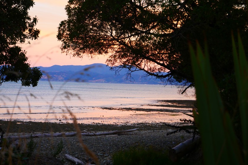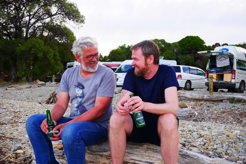 Heute wollen wir an die Tasman Bay an der Nordküste der Südinsel. Dort ist auch Robert schon eingetroffen. Wir erreichen unseren Platz am späten Nachmittag. Es ist ein kleiner, privat geführter Campground, auf dem man eigentlich nicht reservieren kann. Da er aber sehr beliebt ist, verteidigt Robert unter Einsatz aller zur Verfügung stehender Mittel unseren Platz und macht sich damit wahrscheinlich bei den hippiesken Mitcampern nicht gerade sehr beliebt. Wir sind ihm dankbar dafür, denn die Lage ist wirklich besonders schön. Wir campen auf einer kleinen Landzunge vor Motueka. Und das bei strahlendem Sonnenschein und inzwischen heißen Temperaturen. Nach einem Bier am Strand zeigen wir noch einmal deutlich, dass wir irgendwie anders sind als unsere Mitcamper. Während vor anderen Autos und Zelten die heutige Baked Beans Dose geöffnet und gewärmt wird, gibt es bei uns Humnmer und – erneut – frische Muscheln. :-))))