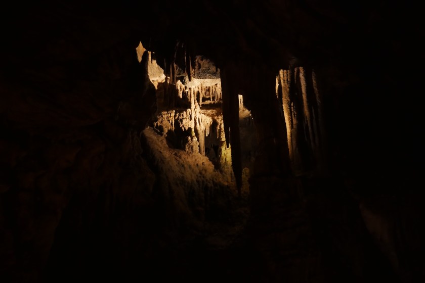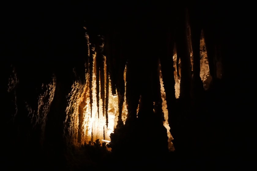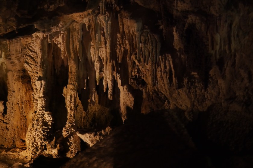 Entdeckt wurde sie Mitte des 19. Jahrhunderts von einem Engländer, erforscht von Franzosen, Deutschen und Italienern im 20.. Wir kommen gerade rechtzeitig zu einer der Führungen, die immer zur vollen Stunde starten. Ausgerüstet mit einem Blauhelm steigen wir in die Höhle. Sie ist größer als ich gedacht hätte, die Stalagmiten und Stalaktiten sind teilweise sehr schön beleuchtet und unsere Führerin, die spricht wie eine engagierte Grundschullehrerin, versorgt uns mit vielen wissenswerten Informationen. So wurden in der Höhle natürlich auch Knochen entdeckt, unter anderem konnte das Skelett eines Moas rekonstruiert werden.