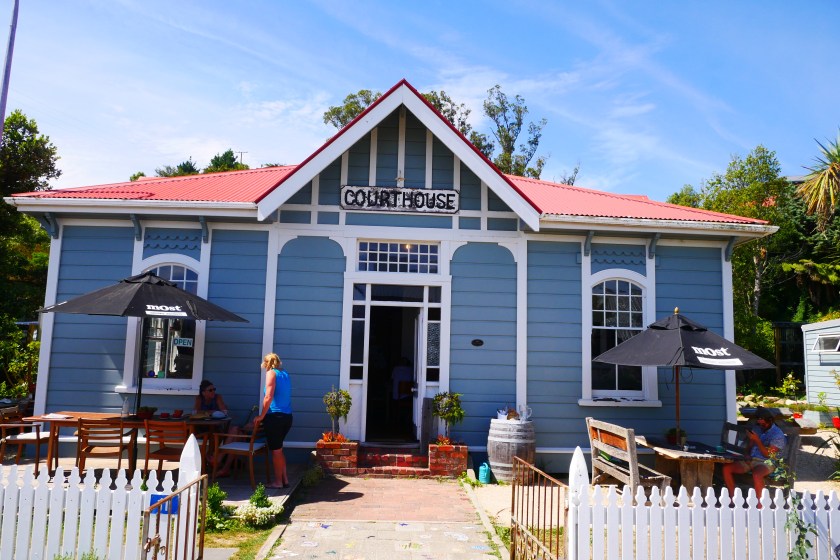 Diesmal können wir nicht, wie wir es eigentlich am liebsten machen, eine andere Strecke wählen, weil es schlichtweg keine andere wohnmobiltaugliche Verbindung in den Nordosten gibt. Das macht aber überhaupt nichts, denn bei unserer Rückfahrt herrscht Ebbe und so sieht zumindest die eine Seite der Strasse ganz anders aus als gestern. Wir treffen uns mit Robert auf einen letzten kurzen Kaffee in Collingwood. Das Café ist im ehemaligen Gericht des Örtchens untergebracht und hat, wie so viele der Kneipen und Cafés in Neuseeland einen ganz besonderen Charme. Noch einmal drücken, noch einmal Tschüß und gute Reise wünschen, dann trennen sich unsere Wege – zumindest für die nächsten Monate – endgültig.
