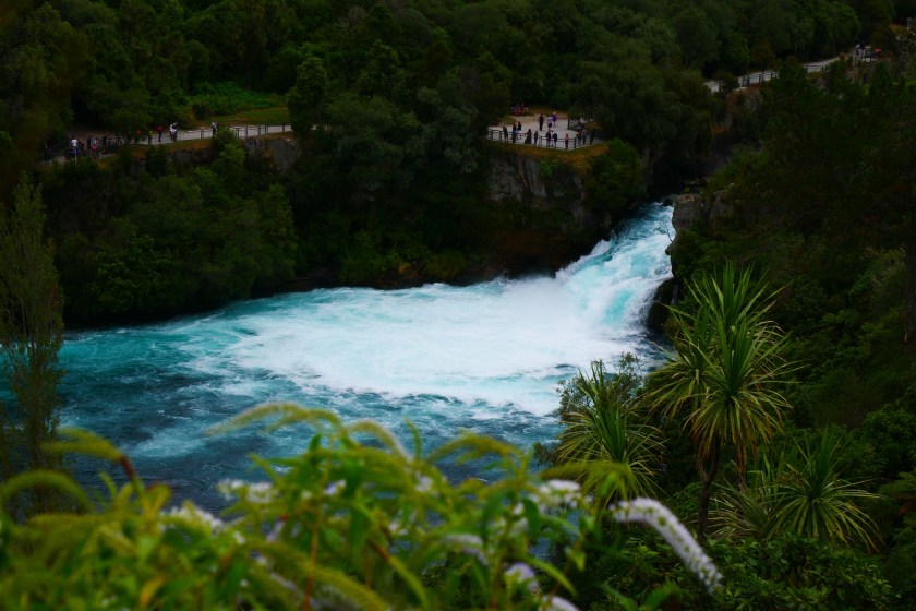 Stattdessen machen wir einen kurzen Abstecher zu den Huka Falls. Diese sind deshalb beeindruckend, weil hier der Waikato River durch einen ziemlich engen Canyon muss, bevor er sich in ein breites Becken ergießt. Das macht ordentlich Lärm und sieht wirklich schön aus.