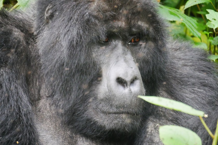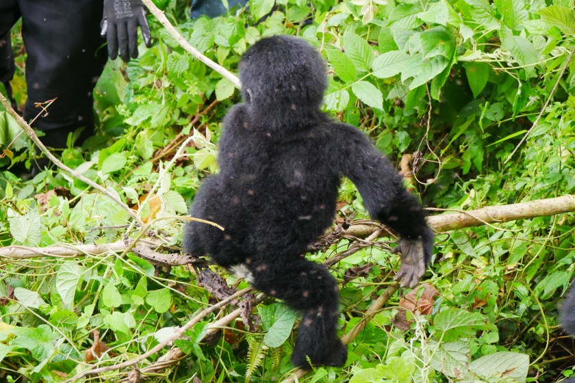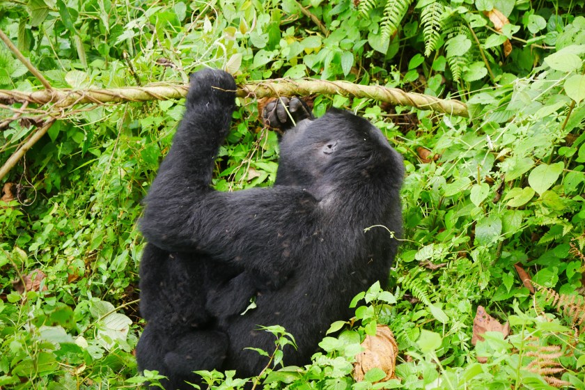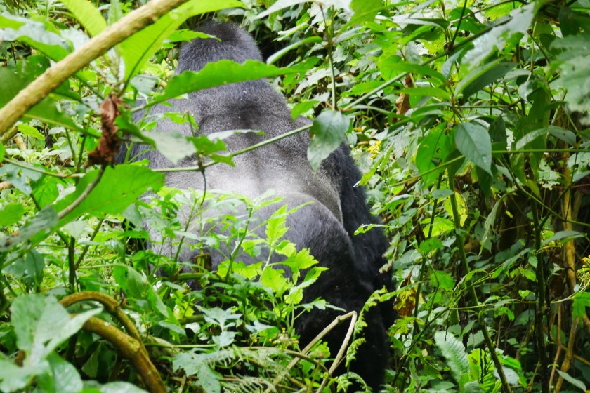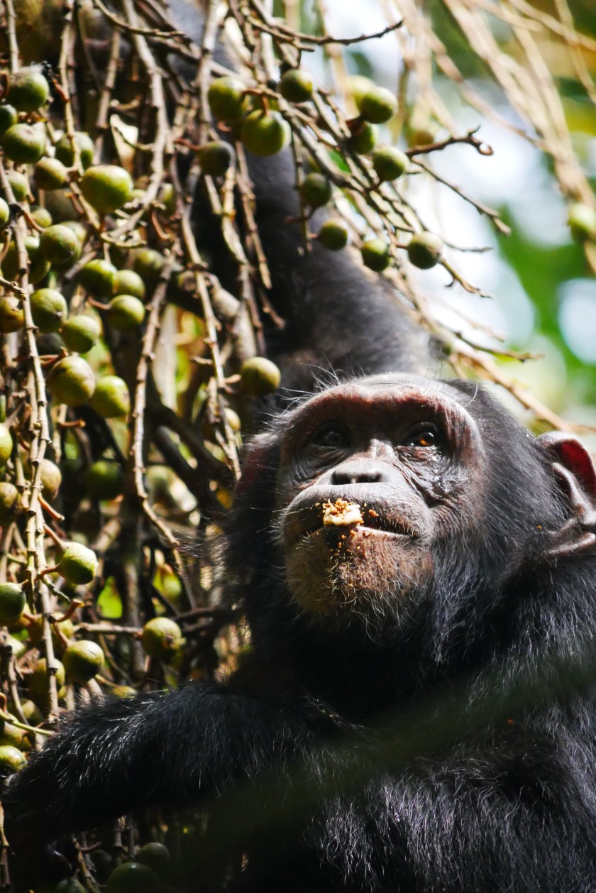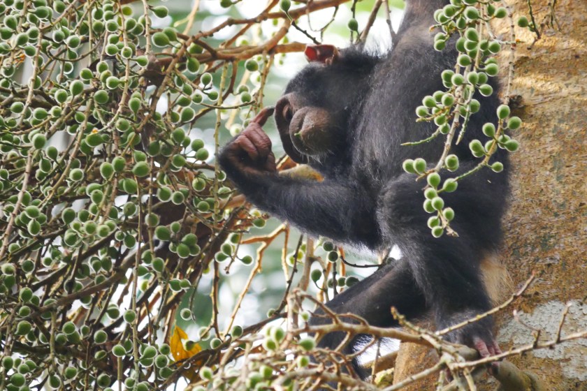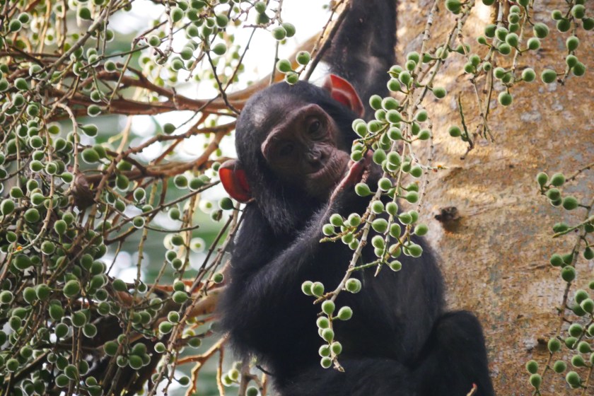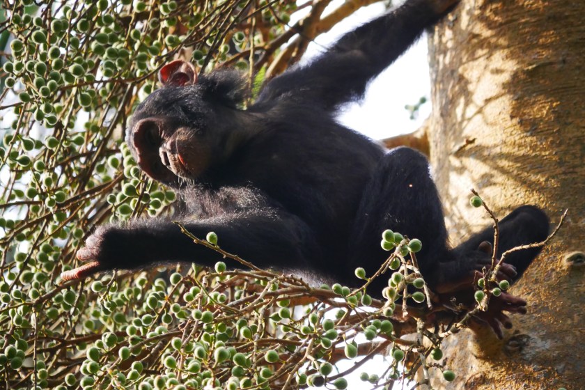 Nach etwa einer halben Stunde Spaziergang durch den Wald entdecken wir die erste Gruppe, es sind 5, vielleicht sechs Tiere, die relativ weit oben in einer Baumgruppe mit Fressen beschäftigt sind. Ausführlich können wir sie beobachten, wenn auch der Blick durch das dichte Astwerk erschwert wird. Irgendwann macht sich die Affengruppe aus dem Staub. Nun wird es etwas hektisch, denn unser erfahrener Ranger, er ist einer der Seniors des Parks will die Tiere am Boden verfolgen. Eine Viertelstunde lang pirschen wir durchs dichte Unterholz, immer die Warnung unseres Guides im Kopf, dass so manche Pflanze Ausschläge hervorrufen kann. Dann ist es geschafft, ihr haben die Gruppe wiedergefunden, sie hat sich unterwegs vergrößert. Es sind noch mehr Schimpansen, diesmal am Stamm eines Baumes und nur wenige Meter über uns. Völlig unbeeindruckt setzen sie ihre Mahlzeit fort, eine großes Muttertier hat zusätzlich ein Stück eines frisch gerissenen kleinen Affens (natürlich einer anderen Art) im Maul. Einige verlassen zwischendurch den Baum, laufen ein paar Meter vor uns völlig entspannt über den Waldboden und verschwinden im Dickicht.
