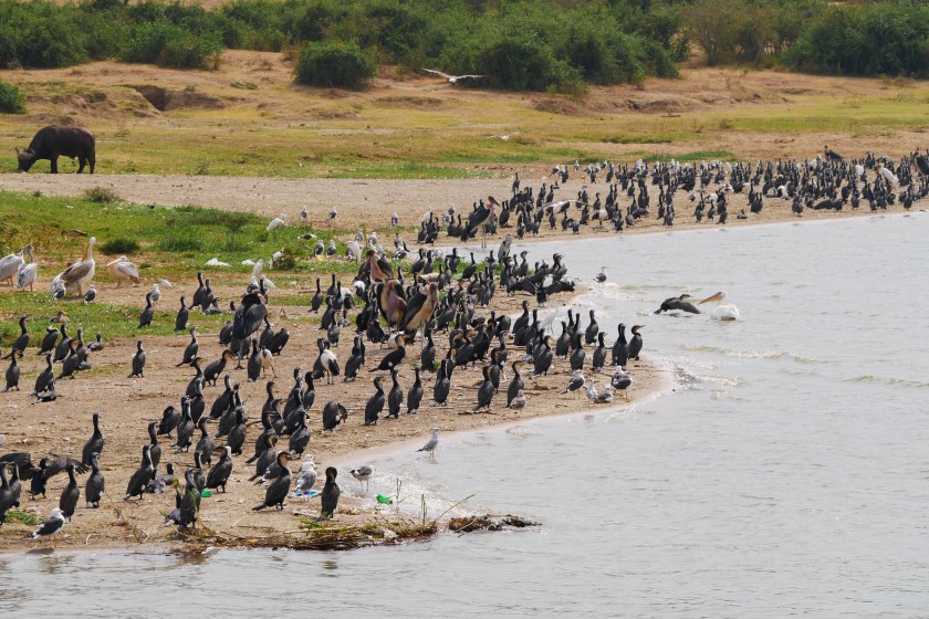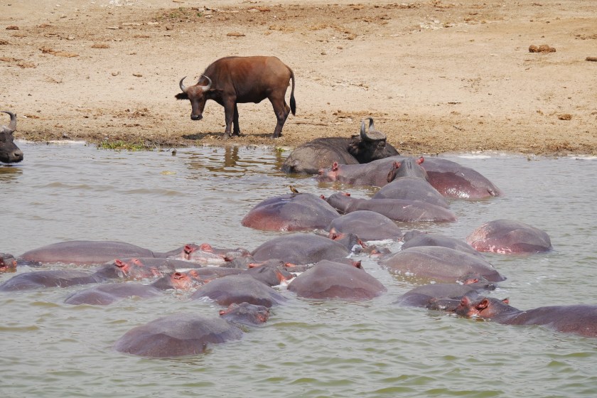 Zweiter Tag im Queen Elizabeth Nationalpark und das nach einer ziemlich lauten Nacht. Fledermäuse tobten zwischen der Innen- und Aussenplane unserer Zeltbehausung hin und her während mindestens ein Nilpferd laut röhrend durchs Camp marschierte und mit seinen Kollegen im Kanal kommunizierte. Wir wollen heute in den südlichen Sektors des Parks um dort die Löwen von Ishasha aufzuspüren. Das besondere an diesen Tieren ist, dass sie, nicht wie ihre Kollegen in den anderen Nationalparks, am Boden leben, sondern auf Bäume klettern. Sie zu finden ist aber Glücksache und nach etwa anderthalb Stunden im Park und keinerlei Tipps von Rangern oder anderen Guides, mit denen Noel regelmäßig telephoniert, geben wir auf. Es ist das erste nicht erreichte „Ziel“ unserer Safari, das wir aber alle ohne große Schwermut wegstecken. Schließlich haben wir im Verlauf unserer Reise schon so viel erleben dürfen, dass dies nicht einmal ein bißchen wehtut (ausser vielleicht Noel, der wirklich durchgehend bemüht ist, alles zu zeigen, was möglich ist!!!).
