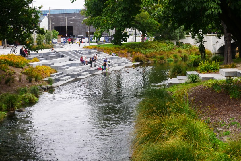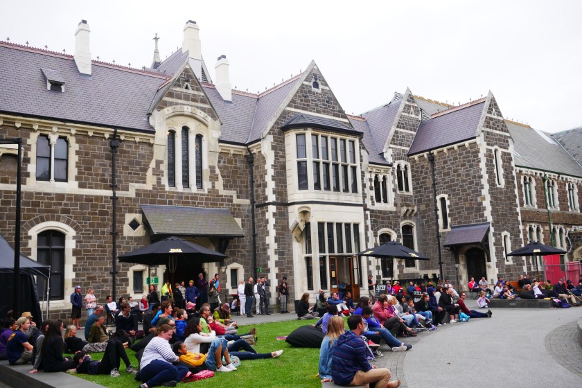 Nach einem kurzen Nickerchen machen wir uns – natürlich zu Fuß – auf in die Stadt. Schon auf der ersten Grünfläche hören wir laute Musik, am anderen Ende des großen öffentlichen Parks findet ein Musikfestival statt und es wirkt so, als sei ganz Christchurch angereist von jung bis deutlich reifer, von schick bis abgerockt. Aus der Mischung der Konzertgäste lässt sich nicht erschliessen, was uns hier musikalisch erwartet. Erst Google klärt uns auf, es spielen ein paar neuseeländische Bands, unterstützt von Musikern aus Australien und Europa. Der DJ kommt aus London und morgen spielt auf der gleichen Bühne unter anderem TOTO (ich wusste nicht mal, dass es die noch gibt!!!)