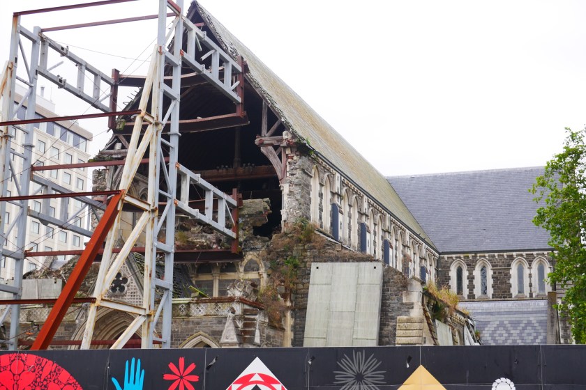 Man kann heute noch erahnen, wie hübsch Christchurch gewesen sein kann, doch davon ist vieles zerstört. Nagelneue moderne Gebäude wechseln sich ab mit Baubrachen. Plätze, umgeben von Bauzäunen und voller Schutt, daneben hübsch restaurierte Häuser und wieder nebenan mit Stahlgerüsten abgefangene Fassaden, um den Einsturz zu verhindern.
