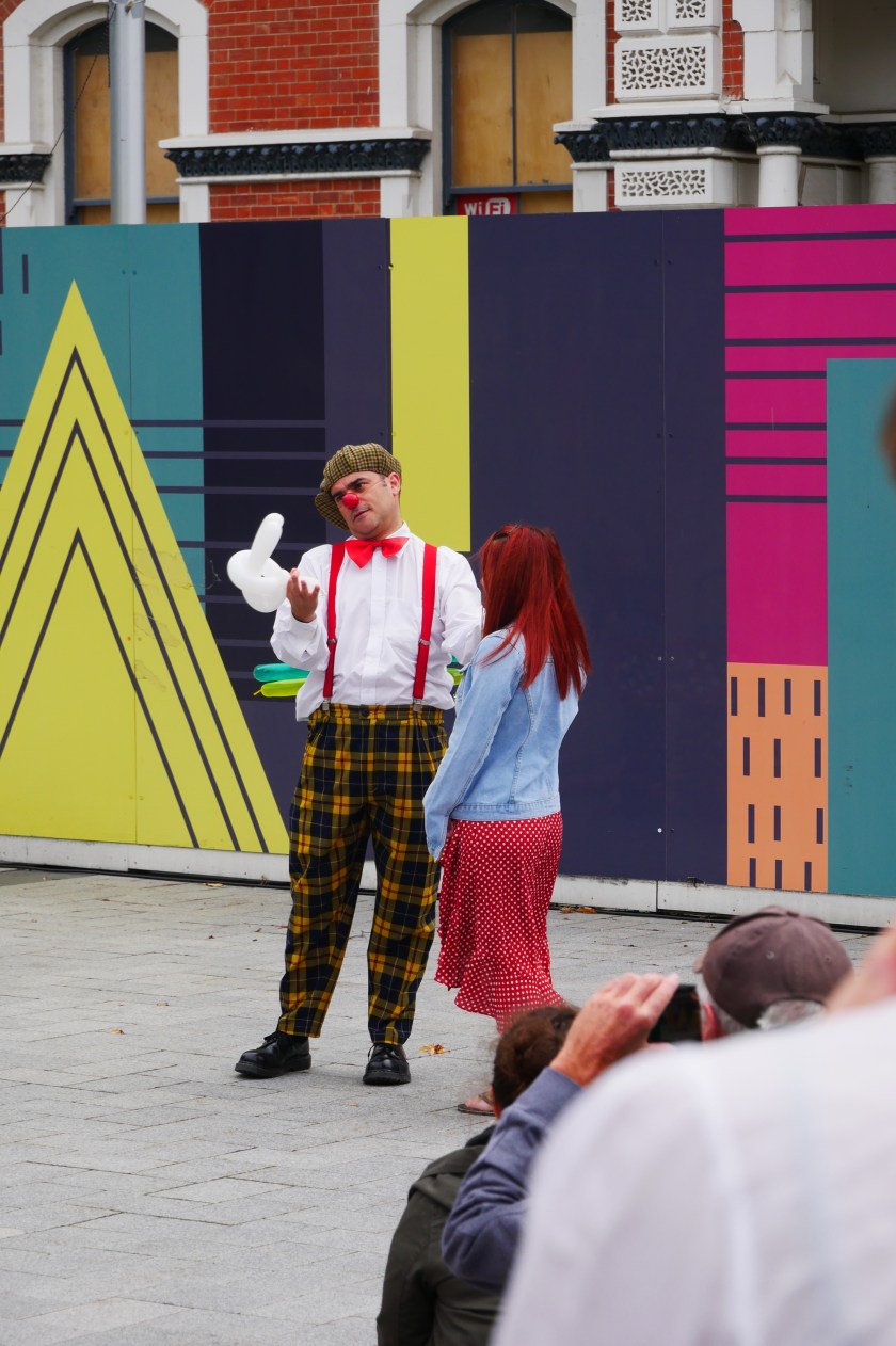 Das Musikfestival ist an diesem Wochenende nicht das einzige Kulturereignis der Stadt, parallel findet ein Gaukler- und Strassenkünstlerfestival statt. Auf Plätzen und in den Höfen des alten College wird jongliert, performt und gesungen, in einem Spiegelzelt treten Musiker auf und viele Bauzäune sind bunt verziert. Diese Stadt, so hat man das Gefühl, stellt sich der Katastrophe entgegen.